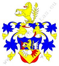 Erb: Dělený štít, nahoře modrý, dole je v červeném zlatý klín s rovnými stranami, v němž je stříbrná okřídlená koule, křídla jsou dělená, pravé je v modré polovině červené, ve spodní polovině stříbrné, levé je dělené opačně, z koule vyrůstá do horní poloviny zlatý lev s červeným jazykem držící v tlapách stříbrný trojúhelník. Na štítě spočívá korunovaná kolčí přílba s modro – zlatými přikrývadly. Klenotem je rostoucí lev ze štítu.