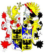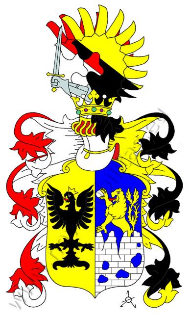 Zlato-modře polcený štít. V pravé polovině černá korunovaná orlice, v levé vyniká za rozstřílenou hradební zdí se čtyřmi stínkami zlatý dvojocasý lev držící v pravé tlapě stříbrnou kouli a levou mající položenou na hradební zdi. Na štítě stojí korunovaná turnajská přílba s červeno-stříbrným a černo-zlatými přikrývadly. Klenotem je od lokte vynikající obrněná ruka s mečem mezi dvěma dělenými křídly – pravým nahoře červeným, dole stříbrným, levým nahoře zlatým, dole černým.