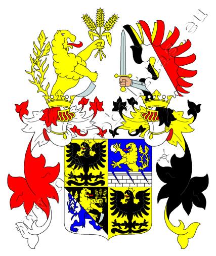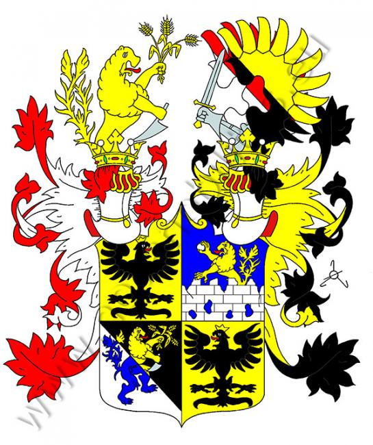 Čtvrcený štít. V prvním a čtvrtém zlatém poli černá korunovaná, do středu obrácená orlice. Druhé pole je modré se stříbrnou rozstřílenou hradební zdí se čtyřmi stínkami, za kterou vyniká zlatý dvojocasý lev držící v pravé tlapě stříbrnou kouli a levou mající položenou na zmíněné zdi. Třetí pole je černo-stříbrně kosmo děleno s do středu štítu obráceným lvem (v horní polovině zlatým, v dolní modrým), který drží v pravé tlapě železnou radlici, v levé, zdvižené, tři pšeničné klasy. Na štítě stojí dvě korunované turnajské přílby s červeno-stříbrnými a černo-zlatými přikrývadly. Klenotem na pravé přílbě je rostoucí lev ze třetího pole štítu, na levé od lokte vynikající obrněná ruka s mečem mezi dvěma kosmo dělenými křídly - pravým nahoře červeným a dole stříbrným a zadním nahoře zlatým a dole černým.
