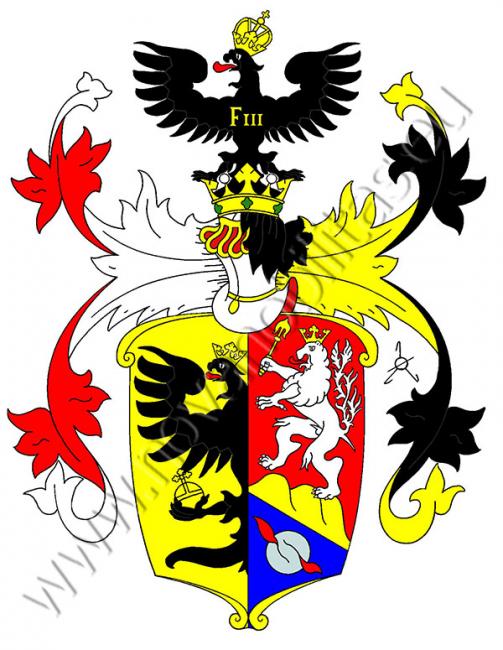 Dělený štít. V pravém zlatém poli je polovina černé korunované orlice se zlatým říšským jablkem ve spáru. Levá polovina štítu je červená s modrou šikmou patou. V horní části pole stojí na zlatém trojvrší zlatý český lev se zlatým žezlem v pravé tlapě, v dolní je železný hořící granát. Na štítě stojí korunovaná turnajská přílba s červeno-stříbrnými a černo-zlatými přikrývadly. Klenotem je černá, císařskou korunou korunovaná, orlice se zlatou iniciálou F III na prsou.