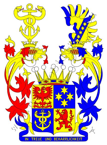 Čtvrcený štít. 1. ve zlatě červená, do středu obrácená orlice s červeným jazykem. 2. v modrém čtyři zlaté hvězdy (1:2:1). 3. v modrém zlatá kotva třikrát ovinutá dvěma proti sobě obrácenými zlatými hady. 4. ve zlatě červený lev s červeným jazykem. Na štítě spočívají dvě korunované turnajské přílby. Klenoty: I. kotva s hady ze štítu, přikrývadla čeveno – zlatá; II. dvě složená křídla, přední zlaté s modrým šikmým břevnem se čtyřmi zlatými hvězdami, zadní modré, přikrývadla modro - zlatá. Pod štítem se vine modrá páska se zlatou devizou IN TREUE UND BEHARRLICHKEIT.