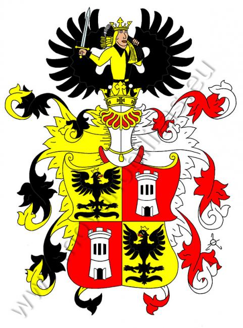 Zlato-červeně čtvrcený štít. V první a čtvrtém poli je černá korunovaná, ven hledící orlice. Ve druhém a třetím poli je kulatá stříbrná věž s otevřenou branou, třemi okny a třemi stínkami na cimbuří. Na štítě stojí korunovaná turnajská přílba s černo-zlatými a červeno stříbrnými přikrývadly. Klenotem je mezi dvěma černými křídly od kolen rostoucí, doleva otočený mladík ve střídavě ve zlato-černě polceném oděvu, držící v pravé ruce meč se zlatým jílcem a záštitou, v levé pak přes rameno nese černo-zlatě dělený snop obilí.